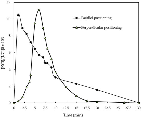 [KCl]/[KCl]0 × 103 vs. time in the continuous EC reactor in both electrodeconfigurations ([KCl]0 and [KCl] are the KCl concentrations in the injected solution and at the outlet of the reactor, respectively).