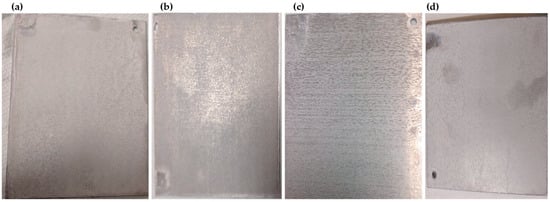 Surface aspect of electrodes after one hour of treatment at different HCDs: (a) without polarity reversal; (b) 0.5; (c) 1; and (d) 2 min HCD (i = 4.7 mA·cm−2, Nel = 6, Q = 20 L·h−1).
