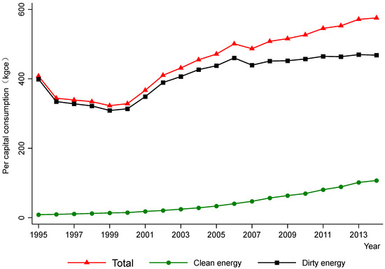Figure 1 illustrates the evolutionary trend of rural domestic energy consumption and the transition to cleaner sources in China from 1995 to 2014. Both per capita rural energy consumption, per capita clean energy consumption, and per capita non-clean energy consumption exhibit a clear upward trend. Specifically, per capita rural energy consumption exhibited a downward trend followed by an upward trajectory, with a slight decline in 2006 and a sustained increase. In comparison, the per capita consumption of non-clean energy for rural areas mirrored that of total domestic energy consumption until 2007, after which its growth rate slowed considerably. Conversely, per capita clean energy consumption for rural areas has consistently risen from 1995 to 2014, with a notably accelerated growth rate post-2007. Hence, the trend in rural domestic energy consumption is primarily driven by non-clean energy consumption before 2007 and clean energy consumption after that. Rural domestic energy consumption continues to be predominantly fueled by non-clean sources, with per capita non-clean energy consumption at 468.2 kgce and per capita clean energy consumption at 107.2 kgce in 2014. The clean transition rate is 18.6%, considerably lower than the 55.8% observed in urban areas (Table A1).