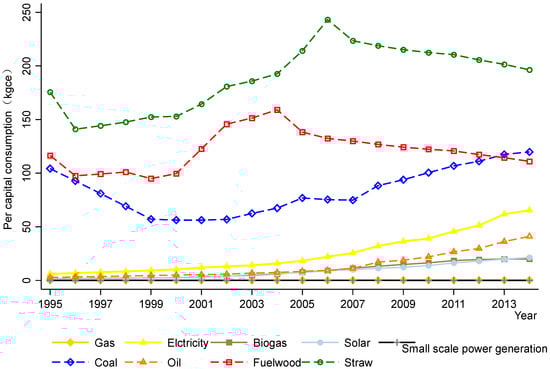 The primary cause of the high proportion of non-clean energy consumption was significantly higher consumption of coal, fuelwood, and straw compared to other energy sources, with per capita consumption of coal, fuelwood, and straw amounting to 119.8 kg, 111.0 kg, and 196.4 kg, respectively, in 2014 (Figure 2). Although the per capita consumption of fuelwood and straw began to decline in 2004 and 2006, the significant consumption of both appears challenging to reduce substantially in the short term. Moreover, the per capita consumption of coal and petroleum in rural areas has continued to increase since 1999, with a notably higher growth rate post-2007 (Figure 2). This trend has undoubtedly heightened the challenge of transitioning to cleaner rural domestic energy sources. However, with nearly 100% rural electrification and a desire for a better lifestyle, households are replacing dirty fuels like coal, wood, and straw with electricity, purchased through the use of energy-efficient appliances such as air conditioners, water heaters, and gas stoves, which significantly reduce time spent on domestic tasks. Rural biogas and solar energy consumption increased from 1995 to 2014 (Figure 2).