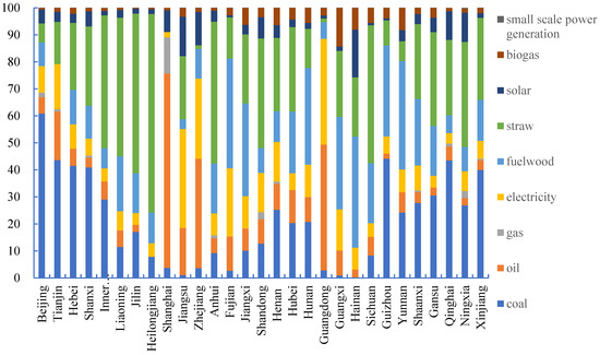 Regional structure of rural domestic energy consumption in 2014. Source: The authors performed a statistical compilation based on data from the China Rural Energy Yearbook, China Energy Statistical Yearbook, and China Rural Statistical Yearbook over the years, and data from the General Station of Agroecology and Resource Conservation of the Ministry of Agriculture and Rural Development.