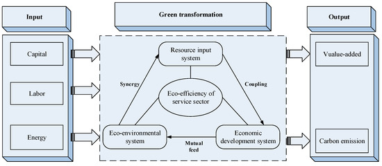 Alcántara and Padilla [26] argued that the environmental friendliness of the service sector may be an illusion, and the environmental cost produced by the service sector should not be neglected. Therefore, the development of the service sector needs to follow the principle of maximizing economic benefits and minimizing ecological costs. Referring to the concept of agricultural eco-efficiency [9,10] and industrial eco-efficiency [5,14], this study considers EESS as the extent to which the desirable (value-added of service sector) output is maximized and undesirable output (carbon emission from service sector) is minimized by investing a certain number of resource factors such as capital, labor, and energy (Figure 1). The improvement in EESS aims to form a coupling coordination relationship between the resource input system, eco-environment system, and economic development system, thus accelerating the green transformation of the service sector.