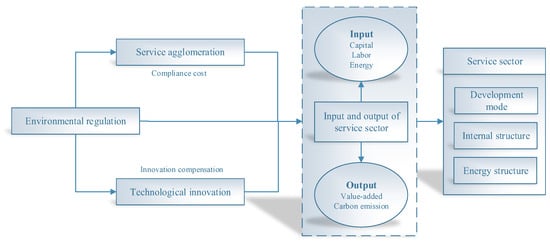 With the scale expansion of the service sector, the relevant issues of ecological damage and environmental pollution have been gradually exposed. The Chinese government has set out to strengthen environmental regulation in association with the service sector. For instance, governments at all levels put forward the goal regarding the optimization of the service sector’s structure and cultivate emerging service sectors that are low-consumption, low-emission, and high-value-added [6]. At the level of sub-sector, the Ministry of Transport in China actively controls vehicle pollution, promotes new energy vehicles, and encourages green travel. Previous literature has investigated the influence of environmental regulation on the green transformation of the service sector [20], energy efficiency [21], or carbon emission intensity [7] under the framework of multi-factor analysis, while there are viewpoints regarding the role of environmental regulation that remain controversial. Therefore, there is more empirical evidence about the association between environmental regulation and eco-efficiency of the service sector (EESS) under the framework of single-factor analysis. Although Gan and Wang [22] explored the effect of environmental regulation on the EESS by using fsQCA under the framework of multi-factor, the influencing paths, as well as the threshold effect of environmental regulation, warrant more research. Taking into consideration these gaps, this study plans to answer the following questions: Can environmental regulation improve the EESS? What are the influencing mechanisms? Whether the impact of environmental regulation on the EESS is dynamic and non-linear? Consequently, based on the Chinese provincial data, this study investigated the effect of environmental regulation on EESS through the two-way FE model. Furthermore, the influencing paths and the threshold effect were examined by the mediation effect model and the threshold effect model.