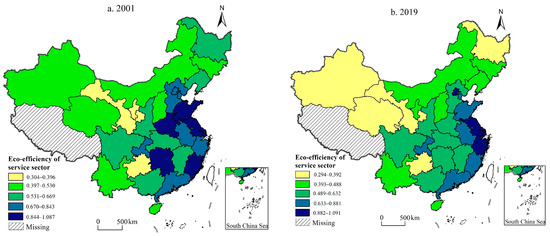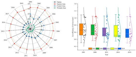 As shown in Figure 3, the EESS in China and three areas presented a downward, resulting from the situation that the development mode-driven factor investment rapidly expands the size of the service sector, thus bringing about more carbon emissions. Moreover, the augment of input redundancy has an inhibiting influence on the enhancement of EESS. The EESS in the Eastern Area is always greater than the national average value from 2001 to 2019. First, the prosperity of modern service sectors such as modern logistics, digital finance, and technical services lowers input redundancy. Second, green technological innovation effectively promotes the utilization of clean energy, thereby decreasing carbon emissions. According to the box diagram, these dots tend to disperse, which indicates that the spatial differences in EESS at the province level in China have become larger from 2001 to 2019. Furthermore, the distribution pattern of these dots changed from “dispersion at the ends and concentration in the middle” to “dispersion in the high values and concentration in the middle and low values”, implying that the EESS in the majority of provinces.