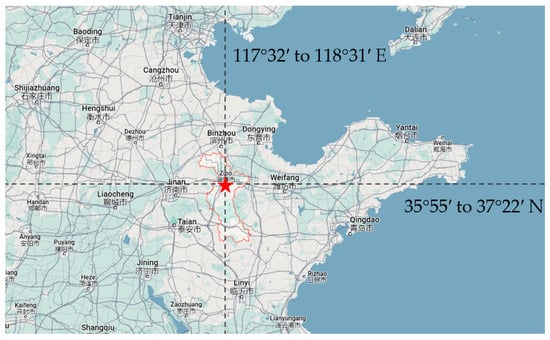 The study area is located in Zibo City, Shandong Province, a representative of cold-climate cities in northern China. Situated between 35°55′ to 37°22′ N latitude and 117°32′ to 118°31′ E longitude (Figure 2), Zibo City falls within the temperate monsoon climate zone, characterized by distinct seasons and significant monsoon influences. This study selects a traditional village in Zibo city as the research object. It is located near the city outskirts, with urban residential areas to the west and east and traditional villages to the south. This situation reflects the current state of many villages adjacent to urban edges against the backdrop of urbanization. These villages face two development possibilities: being assimilated by the city, risking the demolition of houses within the site, or undergoing protective development while preserving the existing village structure. This can be achieved through functional replacement, street renovation, and partial development to transform the original village. Due to space limitations, this article will simplify the preliminary design strategies related to the village’s historical context and relationship with the city. Instead, the focus will be on how the design workflow integrates performance optimization and machine learning into the design process.