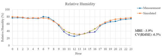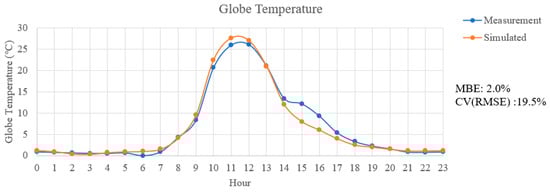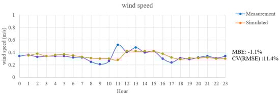 The selected points for microclimate measurement are shown in Figure 3 and are evenly distributed throughout the site to ensure the representativeness of the test results. To ensure the validity of subsequent climate simulation data, this paper collected local meteorological data and compared and verified them with the simulation data. The data were collected using Kestrel NK-5400 instruments (Kestrel Instruments, Delaware, PA, USA) (Figure 4). The NK-5400 was used to collect microclimate data inside the village, including air temperature, relative humidity, wind speed, wind direction, and black globe temperature. The recording interval was 20 s, with measurements taken at a height of 1.5 m from the ground. Simulation data was obtained from nearby weather stations. Considering the impact of mountainous meteorological factors, the Dragonfly plug-in in Ladybug Tools 1.7.0 was used to correct the EPW file before utilizing the data. Due to the impact of the COVID-19 pandemic, after communication with the local residential committee, all measurements were taken over three consecutive days from 23 to 25 October 2022, with an accuracy of ±1 °C. The measured data is averaged by hour. To evaluate the accuracy of the simulation results, mean bias error (MBE) and the cumulative change in the root mean square error (CV(RMSE)) were used. The calculations of MBE and CV(RMSE) are specifically demonstrated in Equations (1) and (2). In Equation (1), Mi represents the i-th measured value, and Si represents the i-th simulated value. The numerator is the sum of the differences between the measured and simulated values, while the denominator is the sum of the measured values. MBE is obtained by dividing the total error by the total measured value. In Equation (2), the numerator first calculates the sum of the squared errors and then divides it by the number of data points (24 h) to obtain the mean squared error (MSE). The denominator is the average of the measured values. Finally, the square root of the mean squared error is divided by the average of the actual values to obtain CV(RMSE). As shown in Figure 5, Figure 6, Figure 7 and Figure 8, the accuracy of the simulations for outdoor air temperature, globe temperature, relative humidity, and wind speed has been validated. The results indicate that the MBE and CV(RMSE) values for each prediction are within the 5% and 20% range, meeting the standards of ASHRAE Guideline 14, IPMVP (International Performance Measurement and Verification Protocol), and FEMP (U.S. Federal Energy Management Program). This demonstrates that the energy model is reliable for subsequent indoor and outdoor environmental simulations. Regarding wind direction, due to the numerous real-time influencing factors and the difficulty of adjusting wind direction data in meteorological files, subsequent simulation analyses will directly use the measured direction data as input for the software simulation (Table 1).