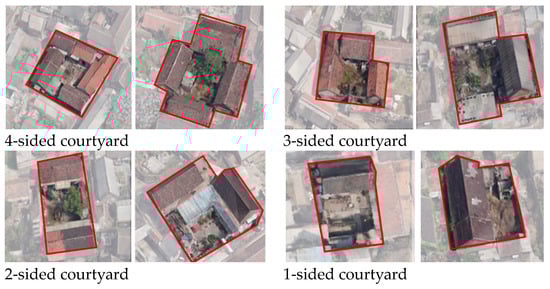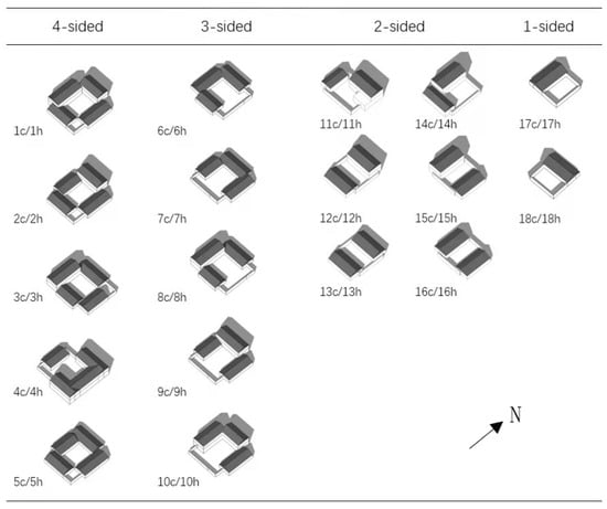The courtyard types in the cold regions of China can be classified into four categories based on the degree of enclosure: 1-sided, 2-sided, 3-sided, and 4-sided. The number in front of each category indicates the number of buildings in the courtyard. Figure 9 is an aerial photograph of the various types of courtyards surveyed in this study. This article has conducted a preliminary screening of 415 residential buildings within the scope of the base. After sorting and analysis, 34 courtyards with regional characteristics were extracted. These courtyards are mainly north-south-oriented, with deviations within 35 degrees from east to west. Also, due to terrain constraints, some are east-west-oriented, accounting for 20%. The relevant data is obtained from the local Planning and Natural Resources Bureau. 18 models have been developed, considering the enclosure degree, size, orientation, height of surrounding buildings, and other factors. In all kinds, the dimensions and materials of the relevant building units, the courtyard’s underlying surface material, and the openings are similar. Table 2 and Figure 10 show the classification process based on the development model of 34 traditional courtyards, respectively.