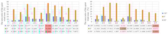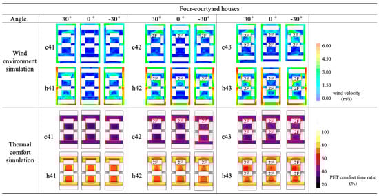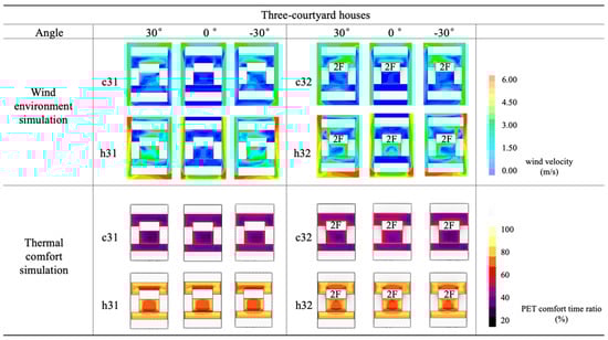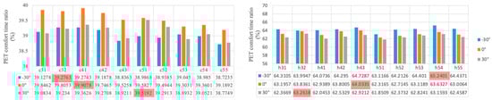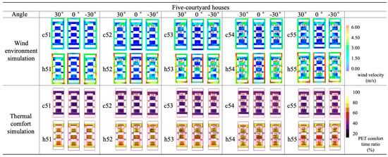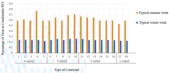 This paper selects physiological equivalent temperature (PET) as the judgment criterion for selecting the Baseline model. During the actual simulation process, it was found that due to a few abnormal temperature measurement values at individual time points in the EPW data, the calculated PET values fluctuated. This paper sets the temperature control range in summer and winter, that is, by counting the proportion of test time in the total test time when the perceived temperature is less than or equal to 32 °C in summer and higher than 5 °C in winter, to reduce data fluctuation risk caused by abnormal values. The relevant literature indicates that the acceptable range of PET differs slightly between urban and rural areas in cold regions. For urban areas, the lower limit is 9.8 °C, and for rural areas, it is −2.48 °C. The upper limits are 30.7 °C and 36.33 °C, respectively [38,39]. Considering that this study focuses on the traditional village located in suburban areas, the thresholds are set to the average of the aforementioned values. Thus, the lower limit is set at 5 °C and the upper limit at 32 °C. As shown in Figure 11, the results of the PET comfort time ratio numerical analysis show that in the quadrangle courtyard classification, type 4 has the highest comprehensive score in summer and winter, whose design considers the need for wind protection in winter and heat insulation in summer. In the 3-sided courtyards, the overall score of types 9 and 10, similar to each other, is higher than in other courtyards. Since fewer categories of 1-sided courtyards exist compared with 2-sided courtyards, the results show that type 11 has the best overall score.