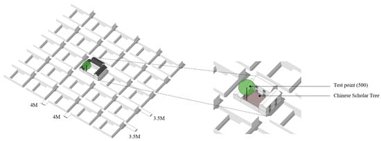 Based on the previous analysis, this section selects types 9 and 10 as the baseline models for the study. Both are 3-sided courtyards, differing in the number of floors in the secondary building of the courtyard. The baseline model and site modeling are shown in Figure 12. The surrounding courtyard dimensions are set to 20 m by 18 m, and the model is simplified to improve computational efficiency. Street widths are set based on survey experience: 4 m for north-south and 3.5 m for east-west. The parameters for the central baseline model are the average values of all courtyard sizes in the surveyed area. Other building performance parameters are set according to local planning regulations and empirical values. HVAC parameters use ideal values, referencing the best local rural self-built houses (Table 3). In addition, there is a Chinese scholar tree in the courtyard, and there is a corresponding schedule setting in the Honeybee 0.0.66 software to reflect the changes in porosity in summer and winter. The baseline courtyard’s design parameters and performance goals will be explained in the next section and will not be repeated here.