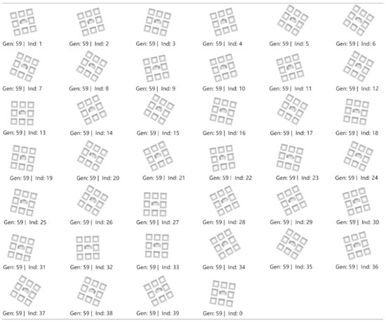 This study employs a genetic algorithm within the Wallacei_X platform to conduct performance-based, multi-objective optimization for design generation. Genetic algorithms (GAs) are rooted in Darwin’s theory of natural selection [41]. Among them, the Multi-Objective Genetic Algorithm (MOGA) has proven particularly effective in optimizing building energy usage, having been widely applied to enhance building designs, optimize HVAC systems, and integrate renewable energy sources [42,43]. The genetic algorithm settings are as follows: a population of 40 individuals evolving over 60 generations, with a crossover probability of 0.9, a mutation probability at a default value, a crossover distribution index of 20, a mutation distribution index of 20, and a random seed of 9. The simulation generated 2400 solution sets. Figure 13 depicts the morphological distribution of all 40 solution sets in the 59th generation of the Pareto front.