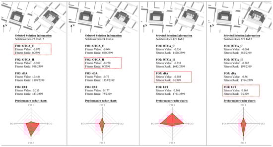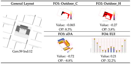 Figure 14 illustrates the courtyard forms under different performance objective tendencies. From left to right, the courtyards correspond to the optimal results for FO1 through FO4 performance objectives. The bottom row displays radar charts of the performance tendencies, where the four points of the enclosed colored area represent the four performance objectives. Since the default algorithm setting seeks the minimum value, points closer to the center indicate better optimization results. According to the analysis method set by the Parallel Coordinate Plot, the solution Generation 59, Individual 12 (abbreviated as: Gen.59 Ind.12) ranked first in Average Fitness Ranks. The courtyard parameters and performance simulation results are shown in Figure 15. Further calculations determined the differences between this courtyard and the baseline model for each performance objective. Dividing these differences by the baseline model’s performance objective values yielded the Optimization Percentage (OP). The performance optimization results indicate a significant improvement in winter comfort by up to 8.3%, while the summer comfort improvement is limited to 3.8%. These two indicators are mutually exclusive regarding indoor lighting and energy consumption: energy savings amount to 32.2%, while illumination decreases by 8.8%. It is important to note that this section’s weight for performance optimization prioritizes winter outdoor comfort. Different weights will yield significantly different optimization results. Therefore, actual evaluations should be based on specific real-world requirements.