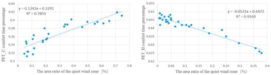 Outdoor Thermal Comfort: Using Physiological Equivalent Temperature (PET) as the evaluation index, Honeybee quantifies this as the proportion of comfortable time. This represents the percentage of time that PET values fall within the 5–32 °C threshold range, simulating typical summer and winter weeks. Since the Wallacei_X platform’s default optimization direction seeks the minimum value, the proportion of comfortable time, which should be maximized, is assigned a negative value. In the subsequent simulations, FO1 and FO2 represent the proportion of comfortable time for winter and summer, respectively.