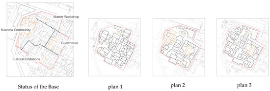 In the specific design phase, the design strategies derived from the previous performance analysis were used to map typical courtyard prototypes and clusters onto the site, followed by adjustments based on project requirements. Depending on the expected outcomes of the schemes, three plans were proposed: preservation-focused, new construction-focused, and phased development-focused, corresponding to plan 1, plan 2, and plan 3 in Figure 24. A machine learning prediction model was used to rapidly evaluate these solutions’ performance in terms of comfort, energy efficiency, etc. Except for the master workshop and business community, the other functional areas were divided into several unit courtyards. Relevant data for these courtyards was input into the algorithm model for evaluation. Due to the unique layout of the master workshop and business community, which includes large spaces and some gray spaces that are difficult to divide into unit courtyards, indoor and outdoor comfort and energy consumption for these areas were calculated directly using the Honeybee plug-in. The results were compared with the performance of unit courtyards in the same area, and a performance rating was estimated.