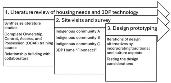 Figure 1) mainly consists of the survey, site visits, and 3DP design prototyping to achieve the goal of a preliminary investigation of housing needs and how 3DP can be adapted to meet the needs of Indigenous communities. First, background knowledge was gained for this study from an extensive literature review and from the OCAP (Ownership, Control, Access, and Possession) training course. This course was developed by the FNIGC (First Nations Information Governance Centre) and was completed by the research team to learn the proper etiquette for engaging with Indigenous communities, as well as the importance of respecting First Nations’ data sovereignty and how to do so. In this study, all the data collected were given to each community’s representative so they not only have access to it but also own it and can do anything they want with it. We used the principles of the OCAP course to minimize the harm of third-party involvement and maximize the benefits to First Nations.