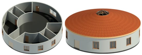 31]. The design consists of 3D-printed walls using reinforced concrete in a circular shape, a steel and timber circular roof slightly sloped, with a conical-shaped skylight in the center; doors and windows are made of wood. The house has an entrance to the living room right in the center, the living room is directly connected to the kitchen, creating an open-concept environment, and the bedrooms and bathrooms are located around the circle in the center. There are two larger bedrooms, one of them being a master bedroom with a bathroom in it; there are two bathrooms, one for the master bedroom and the other one connected to the living room; there is a smaller bedroom which can also be an office, according to the owner’s choice, and there is a laundry room next to the kitchen. The second entrance is through the kitchen door.