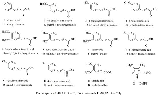 The names and chemical structures of cinnamic acid derivatives 1–20, vanillic acid (21), methyl vanillate (22), and DMPP.