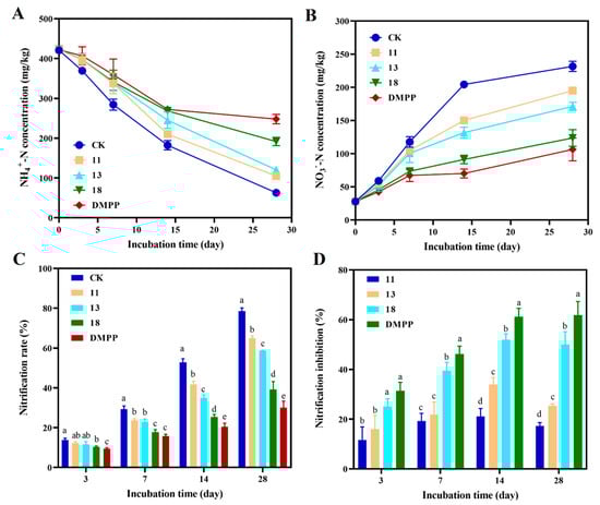 Changes in the concentration of NH4+–N (A) and accumulation of NO3−–N (B) in soil used to grow vegetables, the variation in nitrification rate (C), and nitrification inhibition (D) during the incubation. Error bars indicate the standard deviation of the mean (n = 3); means followed by different letters are significantly different at the 0.05 probability level according to Duncan’s multiple comparison test.