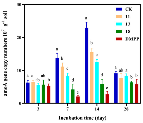 To reveal the nitrification inhibition mechanism, the effect of different compounds on the AOB population abundance in terms of the amoA copy number per gram of soil were evaluated during the 28-day incubation. The amoA copy number of CK increased from 6.3 × 107 at day 3 to 22.9 × 107 at day 14 and decreased to low level of 9.1 × 107 copies g−1 dry soil at day 28 (Figure 3). The amoA copy numbers in treatments with 11, 13, 18, and DMPP were lower than that in CK during the incubation. Especially at day 7 and day 14, the amoA copy numbers were significantly (p < 0.05) reduced to 19–32%, 40%–45%, 70–75%, 85%–88%, respectively for 11, 13, 18, and DMPP as compared to CK. Like the liquid culture experiment, the qPCR results indicated that compounds 11, 13, and 18 could also significantly inhibit AOB growth in soil. This evidence indicated that the observed nitrification inhibition effects were probably due to a direct inhibition of compounds 11, 13, and 18 on AOB growth.