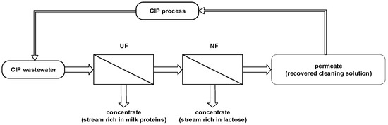 One of the most important steps leading to the rationalization of water and wastewater management in dairy plants was the implementation of CIP technology and replacing the conventional cleaning of production lines and equipment using alkalis and acids with single-phase detergents. New detergent formulas are mainly composed of alkalis or acids, surfactants, complex disinfecting agents, and defoamers [3]. This change in the pattern of cleaning eliminates two steps from the washing procedure (the intermediate rinse and the second circulation of detergent solution) and results in time and water savings, as well as a considerable reduction in energy costs for heating the washing solution and for recirculation pumps [3,4,5,6]. However, wastewater from CIP operations is still not being properly managed and constitutes a major environmental and economic problem for industrial plants [7,8]. These CIP streams contain rinsing water, specific organic residues for the production profile expressed with a high level of chemical oxygen demand (COD) and biochemical oxygen demand (BOD), and chemical cleaning agents [9]. Traditionally, CIP solutions are discharged after one or several uses [10]. The multiuse of cleaning solutions without proper treatment creates favorable conditions for the multiplication of microorganisms, which constitutes a significant sanitary threat, especially in the case of food production [11].