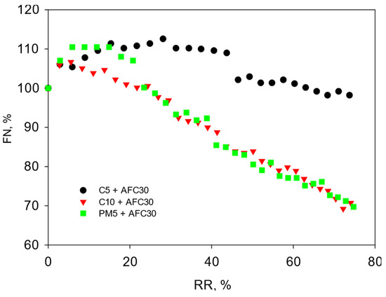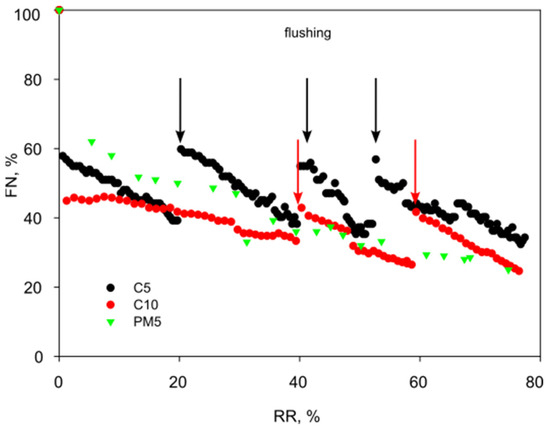 The pre-treatment of spent detergent solutions on UF modules significantly reduced the concentration of organic matter, contributing to a reduction in the fouling of NF modules and its relatively stable flux throughout the concentration cycle. Moreover, the smaller pores of nanofiltration membranes were much less susceptible to penetration by the organic compounds, compared to ultrafiltration membranes (Figure 3). The average values of flux decline (100-FN) of AFC30 were 12% and 11% for the integrated C10 + AFC30 and PM5 + AFC30 systems, respectively (Table 3). However, for the integrated C5 + AFC30 system, an increase in flux was obtained in relation to the permeability of pure water. This phenomenon may be related to both the enlargement of the pores of the polyamide layer and the hydrophilization of the polymer as a result of contact with alkalis [20,21,22,23,24]. Data in the literature indicate that, in PA nanofiltration membranes exposed to concentrated NaOH solutions, changes occur in the polymer structure, causing an increase in pore size [20]. At lower NaOH concentrations, morphological changes were insignificant, and hydrophilicity changes dominated [21]. Gul et al. [22] showed that there was an almost twofold increase in the pore size of the PA6 membrane under a low concentration of alkaline cleaning agent (1% NaOH). On the other hand, increasing the concentration of NaOH up to 5% caused a twofold reduction in the PA6 membrane’s pore size. Jun et al. [23] also showed changes in the hydrophilicity of nanofiltration polyamide membranes. Due to contact with the alkaline solution (pH 13.5) a contact angle decreased from 44.9° to 38.6° for the pristine and the treated membrane, respectively, which resulted from the depolymerization of the amide bond. The authors also confirmed that membranes modified under alkaline conditions showed improved flux with similar rejection of the dyes. Pérez-Álvarez et al. [24] in research on alkaline hydrolysis of PAN membranes showed a significant reduction in the contact angle, and therefore strongly hydrophilic properties of the modified material.