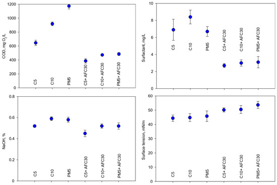 Permeates after the ultrafiltration process were characterized by slightly higher surface tension values (45 ± 0.5 mN/m) compared to the feed solutions (38.1 ± 1.3 mN/m), which is primarily due to the partial rejection of surfactants. The increase in surface tension can also be associated with the removal of proteins, which shows an ability to reduce the surface tension of solutions [38,39].