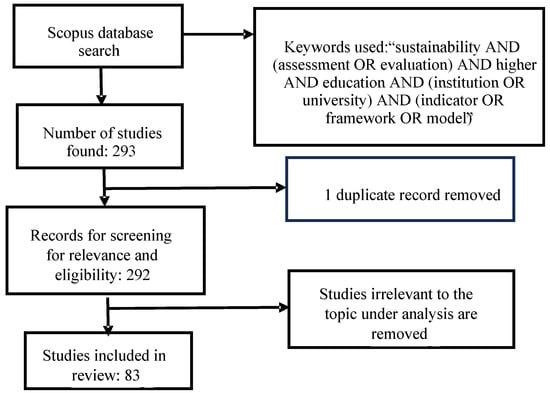 - Literature Screening: Following the PRISMA statement, a recognized approach for systematic reviews, this study applied a rigorous screening procedure as depicted in Figure 1. Starting with 293 papers, 1 duplicate was removed. After detailed review of each publication, all articles that were deemed irrelevant to the research focus were discarded, narrowing down the list to 83 reviews, conference papers, and articles. All the papers that focused on sustainability development through sustainability assessment in HEIs were shortlisted and, hence, others were removed. The final set of papers were selected from the years 2018 to 2023 due to the drastically growing emphasis on education for sustainability, the need for curriculum reform, and the growing importance of sustainability metrics in academia within this timeframe.