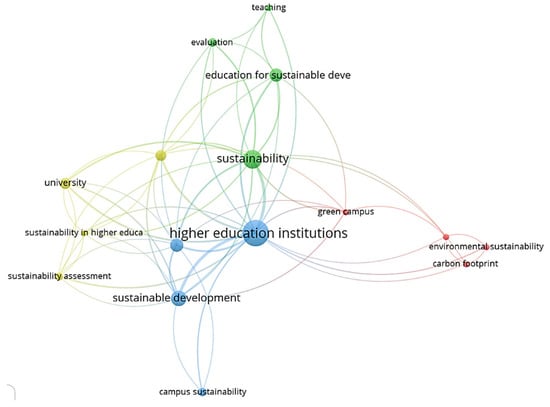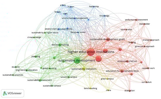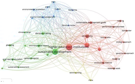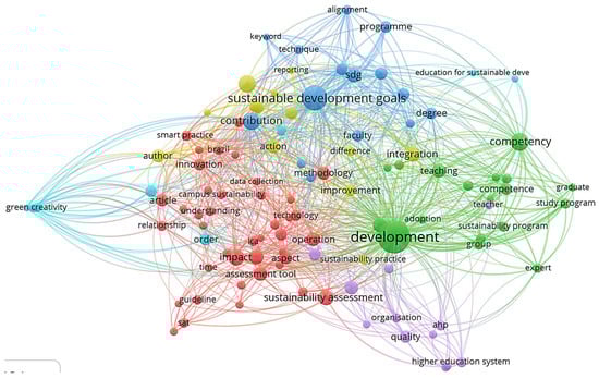 Table 1 provides a compilation of the top 10 terms that appear most frequently. These terms are accompanied by their respective scores, which are calculated by VOSviewer. VOSviewer determines the relevance of each term by analyzing the distribution of second-order co-occurrences among all terms and comparing it to the overall distribution of co-occurrences. The degree of dissimilarity between these two distributions, as quantified by the Kullback–Leibler distance, determines the level of relevance for each term []. The presence of the terms “development” and “sustainable development goals” clearly indicates that widespread research and efforts in developing and achieving SDGs are being carried out by scholars focused on HEIs. The term “student” symbolizes the fact that students are in the epicenter of most of the research as their contribution to social, environmental and education indicators of sustainability is inevitable. Next, the term “competency” highlights the research being conducted on how to instill competencies like problem-solving skills, communication skills, etc., to aid efforts and awareness in the field. “Contribution” and “impact” indicate the set of research studies analyzing the contribution and impact of implementation of different methods/frameworks/tools in sustainability. “Ranking” and “sustainability assessment” emphasize the importance of sustainability assessment in HEIs and how researchers embrace the topic to explore more tools and techniques to assess sustainability. The term “integration” represents the set of studies that assesses and analyzes the extent of integration of SDGs into every dimension of sustainability in HEIs. Finally, the term “campus” indicates that the campus is still considered more by researchers rather than the institution. The analysis sheds light onto the dominant areas of research in the field and the gaps that must be addressed.
