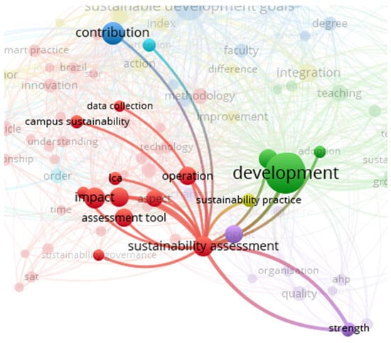 Figure 3 illustrates a network comprising connections among various terms and their application in the realm of research and development within this domain. Multiple terms, such as student, sustainable development, assessment tool, sustainability development goals, and campus, are linked, suggesting the wide-ranging utilization of these terms within the field of study. Additionally, Figure 4 exhibits direct connections between the terms and “sustainability assessment”.