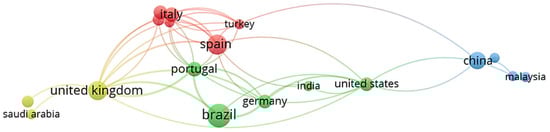 The analysis based on country of co-authorship was performed for 83 documents by setting an occurrence threshold of three. Out of 50 countries, 19 met the threshold, as illustrated in Figure 8.
