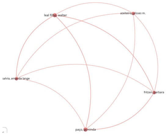 The visualization maps provide an overall view of the relationship between authors and publications in the study of sustainability assessment in higher education. The web presents an idea of the collaboration and knowledge sharing by people from different backgrounds regarding the concept. This would shed light onto trends in the current as well as future research in the field. The result of this analysis provides the number of citations, documents, links, etc., along with the authors’ names as depicted in Figure 9. Thus, the top ten list of authors according to their citations are mentioned in Table 4. Three authors have produced three documents, while all the others in the table have worked on two documents together.