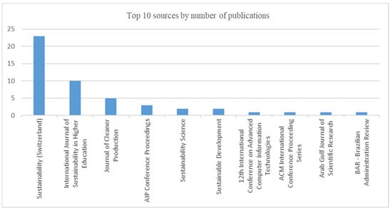 A compilation of sources was derived from the entire collection of 83 publications and organized in a descending fashion based on the frequency of publications. Upon analysis, it was evident that the journal titled “Sustainability (Switzerland)” occupied the foremost position, with the highest number of publications, amounting to 23. The “International Journal of Sustainability in Higher Education” followed suit with 10 publications. “Journal of Cleaner Production” and “AIP conference proceedings” contributed five and three publications respectively, while the remaining sources possessed two or fewer publications. Figure 10 visually depicts the top ten sources and their corresponding number of publications.