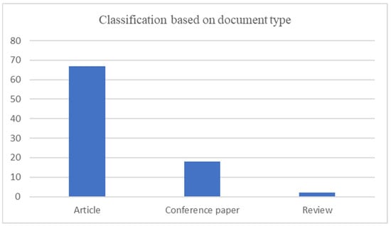 An examination of the 83 papers was conducted to determine the priority in each classification, considering their document types, fields of study, tools utilized, and research types. The analysis based on different document types is depicted in Figure 11. The classification is divided into three categories, namely articles, conference papers, and reviews, as these were the only types considered in the study. Most of the 83 papers fell under the “article” category, while the “conference paper” and “review” categories had comparatively fewer documents. The prevalence of scholarly articles in the dataset is consistent with academic databases like Scopus, underscoring their crucial role as dependable sources of scientific information.