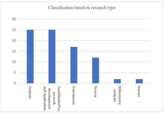 Moreover, an extensive examination was conducted to identify and categorize the specific types of research conducted in each document. The data presented in the chart reveals that most of the research falls under the classification of analysis and the development and application of tools, models, or frameworks. The analysis category encompasses studies that explore the integration of sustainability dimensions into higher education systems and the step-by-step implementation process in educational institutions. The graph in Figure 12 clearly illustrates a significant amount of research focused on creating various tools, models, conceptual frameworks, and techniques to assess sustainability in HEIs. This emphasizes the growing importance of monitoring the sustainability efforts undertaken by stakeholders and policymakers in these institutions. Subsequently, a significant portion of research has been dedicated to assessing sustainability in different aspects of institutions, with a particular focus on environmental sustainability, such as the carbon footprint and the competencies of students, staff, and administrators. As this field of research continues to emerge and gain prominence, numerous reviews have been conducted to analyze past research and to identify effective tools and techniques for integrating sustainability into institutions and ensuring progress toward achieving SDGs. Additionally, some studies have employed bibliometric analysis and systematic content analysis to delve into the content of each document. Furthermore, a few studies have also focused on examining the impact of embracing sustainability in institutions across various domains.