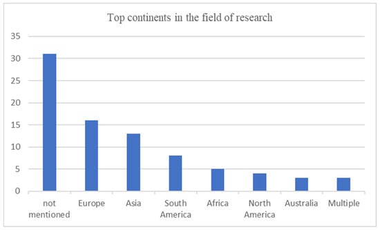 The analysis of the 83 papers revealed diverse geographical focuses of sustainability research within HEIs. As shown in Figure 13, a significant number (30 papers) did not specify the location, indicating that the geographical context may not be central to these studies. However, 16 papers specifically addressed Europe, suggesting a strong regional focus, likely due to stringent sustainability policies, well-established institutional support, and ample funding opportunities that also promote international research collaborations. Asia and South America are also prominent areas of study, reflecting their growing research outputs in sustainability. The analysis underscores that while Europe leads in this area, research on sustainability spans across all dimensions—social, economic, and environmental—globally, highlighting the universal relevance of sustainability issues in higher education.