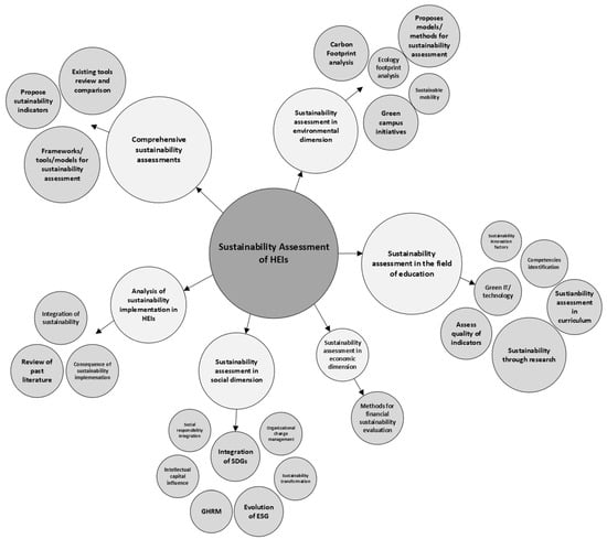 For authors in the field of higher education, the significance of sustainability has taken center stage as institutions increasingly recognize their essential role in shaping a responsible and environmentally conscious future. Scholars and institutions are delving into innovative practices that integrate sustainable principles, aiming to equip students with the knowledge and skills necessary for addressing global challenges. Hence, this section is aimed at an extensive content analysis centered on the topic of sustainability assessment in HEIs. As part of this study, a thematic analysis was conducted on the selected set of 83 papers. Each paper was meticulously reviewed and categorized into six distinct themes, based on the aims and objectives described in the abstracts and paper content. The themes and the papers categorized under each are detailed in the following sections.