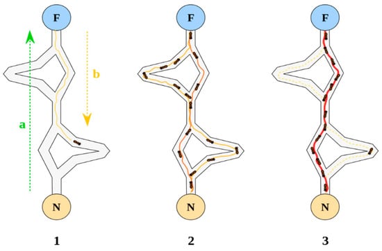 The ant colony optimization (ACO) algorithm is inspired by the actual behavior of ants that live together in large numbers. In a study on Argentinian ants, Goss et al. [27] found that ants find the shortest path between the nest and the food after some time (Figure 1). The formation of this test is based on the fact that ants leave fixed slight amounts of pheromone per unit length when they are moving. These values are subject to changes.