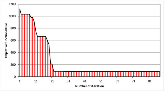 Table 5 reveals that when the algorithm was run five times, the iteration was 80 and the objective function was 82.2587 in the first run, the iteration was 100 and the objective function was 83.8002 in the second run, and the iteration was 70, 60, and 65 and the objective function was 83.3658, 83.6587, and 82.7854 in the third, fourth, and fifth runs, respectively. At this stage, the results show that the lowest objective function occurred in the execution of the first step and the highest in the execution of the second step with 100 repetitions.