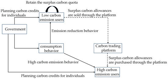 A carbon trading platform is the trading of individual carbon emission rights. From the perspective of supply and demand of surplus carbon allowances, this paper divides users of carbon trading platform into low-carbon users, that is, suppliers of surplus carbon allowances, and high carbon users, that is, those who need the remaining carbon quota. The individual level carbon trading system is shown in Figure 1.