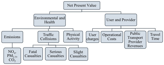 The Net Present Value (NPV) is a metric used to equate the benefits and costs of a transport scheme and is calculated as the sum of all the multiple benefits and costs [33]. Quantifying the NPV requires all the economic costs and benefits to be discounted to the base year, representing the extent to which people prefer current over future consumption [33].