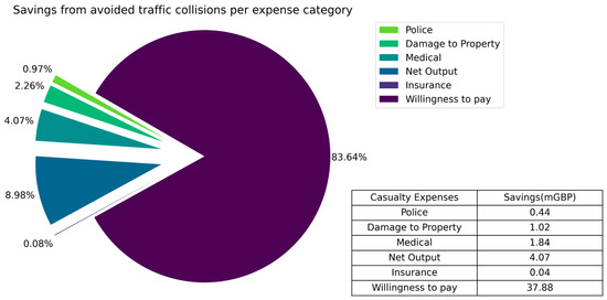 Furthermore, the findings on traffic collisions (Figure 3) indicate significant economic benefits (around 38 mGBP) originating from the Willingness To Pay (WTP) category, contributing to 84% of the total savings, leaving the residual 16% (7.41 mGBP) allocated to the remaining economic categories for traffic collisions. This methodology offers considerable value in dissecting these costs into different categories, as the values for the WTP for avoiding traffic collisions are based on user surveys and therefore highly subjective, since they exclude acquisitions of goods and services and relate only to society’s emotional well-being.