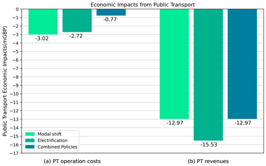 Economic impacts allocated to Public Transport (PT) differentiated into (a) operation costs and (b) revenues as a result of the transport policy scenarios in Table 1.