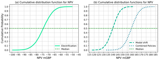 Cumulative distribution functions of the final NPV for the electrification-only and modal-shift and combined policies introduced in Table 1.