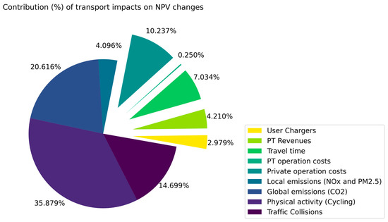 Figure 7, provides a breakdown of the weight these categories have on the changes in NPV, using the results from the combined scenario. The chart shows that local and global emissions, physical activity and traffic collisions contribute to approximately 75% of the total NPV, underlining how important it is to encourage the use of shared and active transportation. Furthermore, in the same chart, five categories are separated from the rest representing the negative economic impacts for this scenario, which contribute to around 25% of the NPV and are therefore far outweighed by the savings achieved.