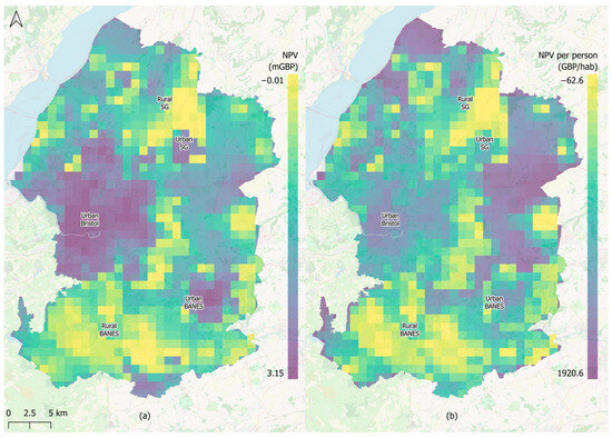 Comparison between the distributed NPV (a) and NPV per person (b) for urban and rural areas of Bristol, BANES, and South Gloucestershire (SG).