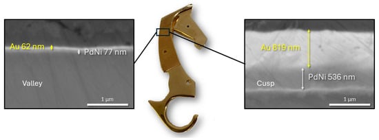Fashion accessories presenting a complex geometry made of many cusps and valleys to represent a horse crest; the difference in deposited thicknesses of precious metals on a cusp and a valley observed in a cross section of the sample by a scanning electron microscopy (SEM) analysis.