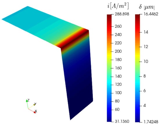 Current density (i) distribution and thickness distribution (δ) over a cathode of irregular shape obtained with CFD simulations by Kauffman [75] (image under Creative Commons CC BY 4.0 license, all rights and intellectual property belong to the authors; for more information, see https://creativecommons.org/licenses/by/4.0 accessed on 15 April 2024).