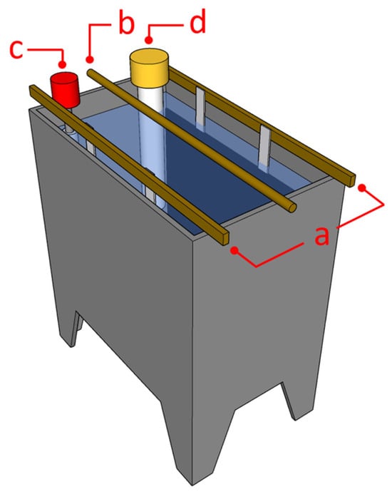 A 500 L electroplating tank containing (a) two anode bars, one for each side, to which the MMO anodes are connected; (b) a central cathodic bar, where the rack is attached; (c) a float to control the level and temperature of the solution; (d) a heating element for heating the solution.