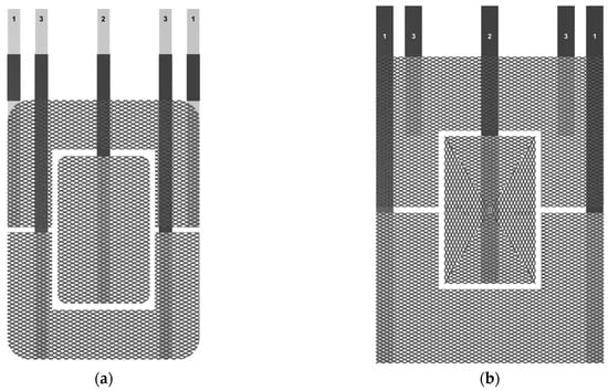 Italfimet RAEP aims for the maximum thickness uniformity of precious metal electroplating filling inside the working rack. The device is based on the supply of DC, distributed inside the electroplating tanks with the aim of minimizing the effect of the presence of areas with high and low current density within the electroplating system. This is achieved by pre-setting the direct current to be distributed in multiple zones within the system itself. In detail, the anodes consist of three anodic elements coated with mixed oxides, which have 3 different anode outputs. Anodes 1 and 3 are the outer ones and have a complementary shape to the inner anode 2 (Figure 4a). The system allows the current of the external anodes to be modulated in a range of instrumental settings from −999.9 to +100.0 (dimensionless values), in the upper section of the anode (“high-cut”) and in the lower one (“low-cut”) independently. Based on the authors’ industrial experience, the current was distributed on the three anodes following Equation (11)