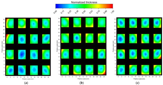 Normalized distributions of electrodeposited gold thicknesses, measured by XRF analysis, relative to a sample obtained (a) under standard conditions (DC1); (b) using the RAEP system; (c) using the HCS. The x and y axes represent the coordinates inside the plating rack, which contains 16 plates arranged in rows and columns of 4. Areas of the rack where there are no plates are shown in black.