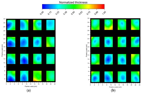 Normalized distributions of electrodeposited gold thicknesses, measured by XRF analysis, relative to a sample obtained (a) under standard DC conditions (DC2); (b) under PC deposition conditions. The x and y axes represent the coordinates inside the plating rack, which contains 16 plates arranged in rows and columns of 4. Areas of the rack where there are no plates are shown in black.